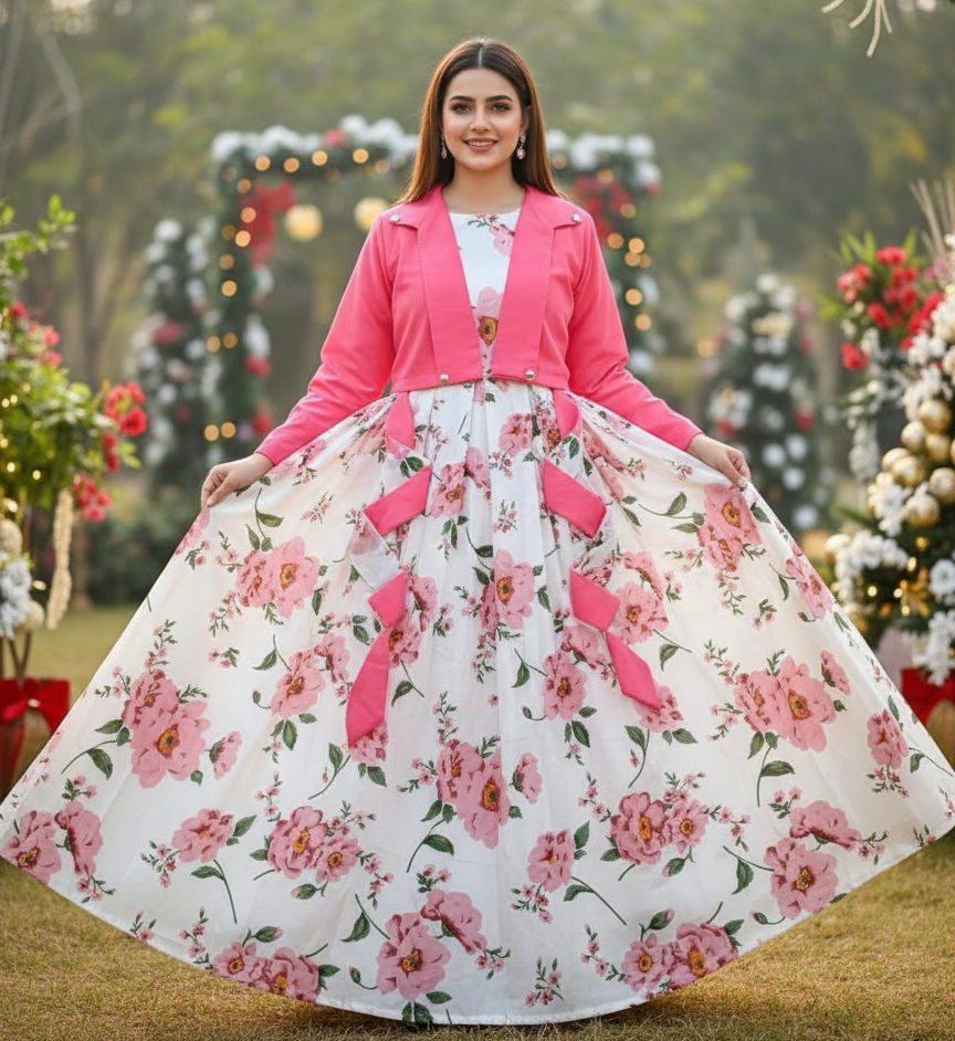 This 2-piece outfit features a digitally printed long-flare sleeveless maxi with an attached belt, paired with a stylish cotton koti that adds the perfect touch of grace and contrast.